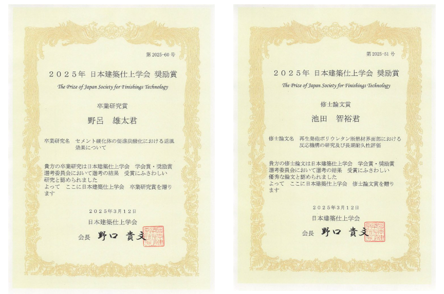 池田智裕君,野呂雄太君が,日本建築仕上学会 奨励賞をいただきました