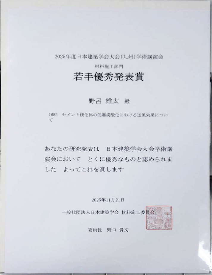 野呂雄太くんが,セメント硬化体の促進炭酸化における送風効果に関する研究で受賞しました。おめでとうございます -