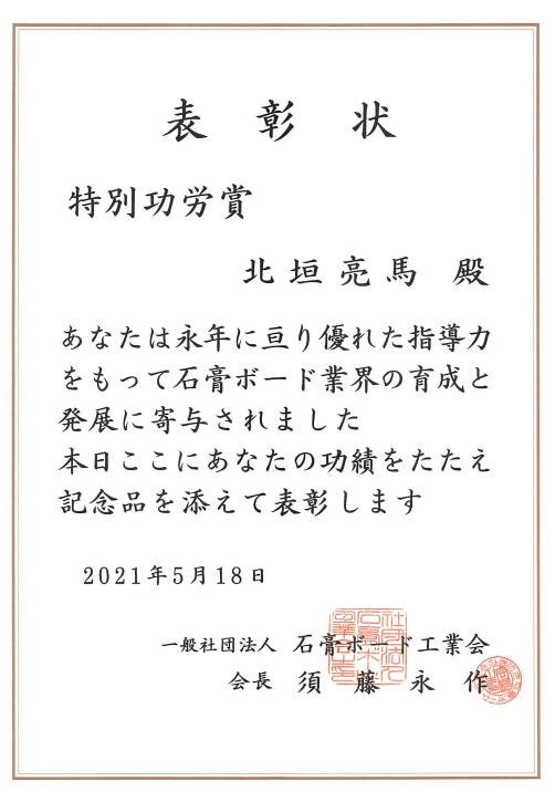 北垣准教授が石膏ボード工業会 特別功労賞を受賞しました。
