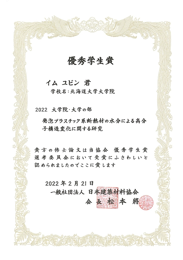 日本建築材料協会より優秀学生賞をいただきました。おめでとうございます! 受賞論文 イムユビン: 発泡プラスチック系断熱材の水分による高分子構造変化に関する研究 ... -